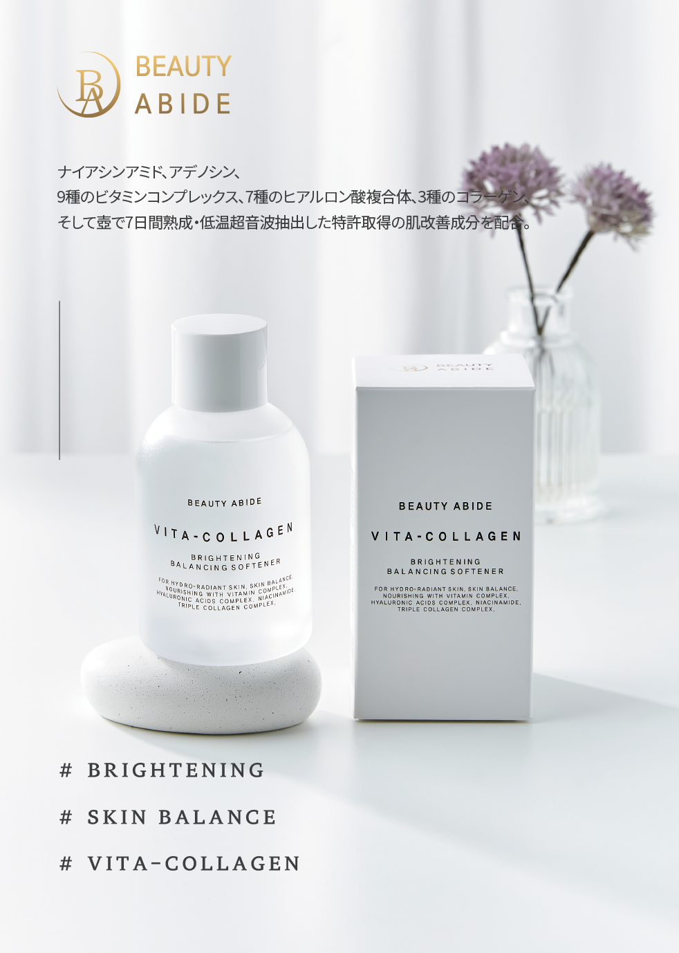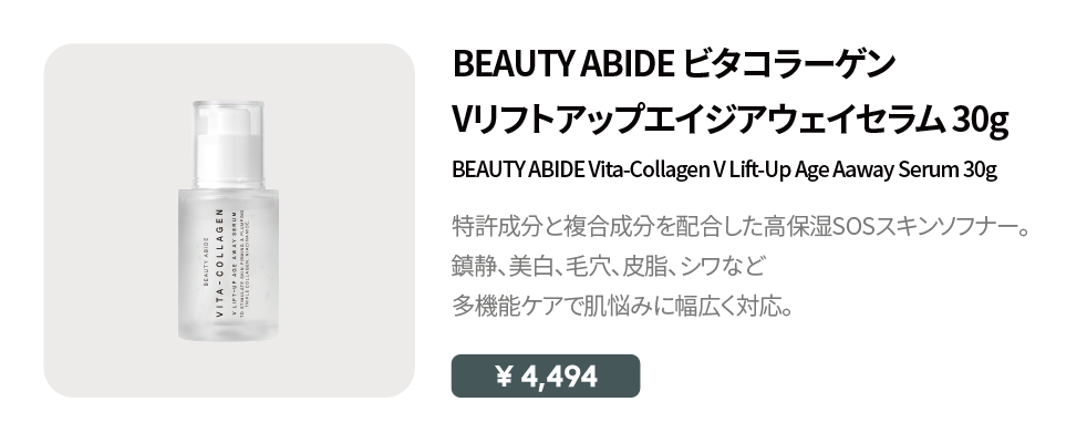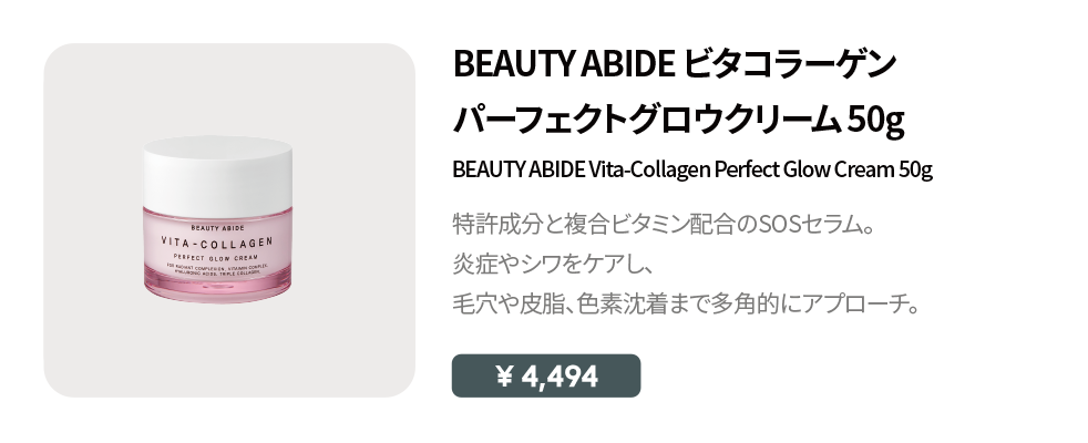 ナイアシンアミド、アデノシン、9種のビタミンコンプレックス、7種のヒアルロン酸複合体、3種のコラーゲン、そして壺で7日間熟成・低温超音波抽出した特許取得の肌改善成分を配合。